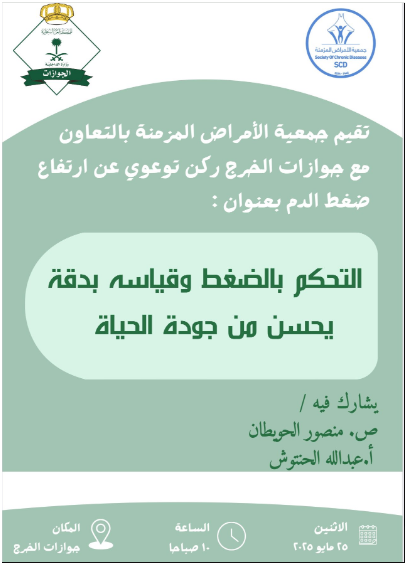 اقامت جمعيه الآمراض المزمنه ركن توعوي بمناسبه اليوم العالمي لإرتفاع ضغط الدم بعنوان ( التحكم بالضغط وقياسة بدقة يحسن من جودة الحياة ) وذلك في مقر جوازات محافظة الخرج وشارك فيه كل من الصيدلي الاكلنيكي منصور الحويطان ، أ. عبدالله الحنتوش