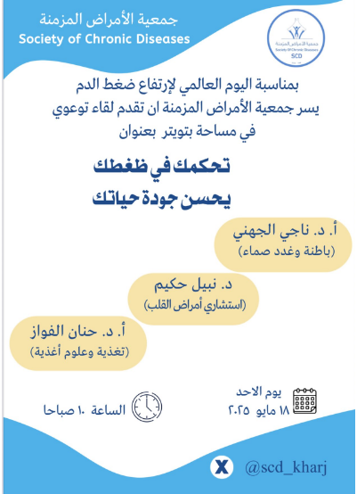 جمعية الأمراض المزمنة تقيم ركن توعوي ولقاء توعوي في منصة اكس بمناسبة اليوم العالمي لإرتفاع ضغط الدم