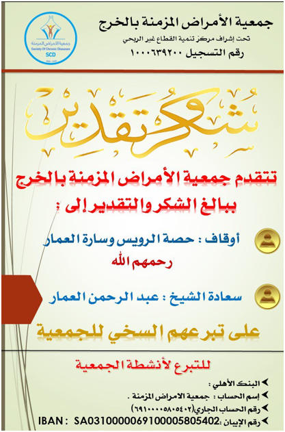 تتقدم جمعية الأمراض المزمنه بالخرج ببالغ الشكر والتقدير إلى أوقاف حصة الرويس وسارة العمار رحمهم الله و سعادة الشيخ عبدالرحمن العمار على تبرعهم السخي للجمعية .